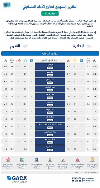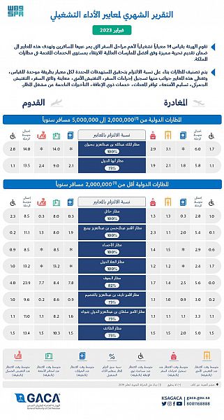 أصدرت الهيئة العامة للطيران المدني اليوم، تقريرها الشهري عن أداء مطارات المملكة الدولية والداخلية، لشهر فبراير 2023م، وفقاً لأربعة عشر معياراً أساسياً لقياس الأداء، وذلك تطبيقاً للتوجُّهات الإستراتيجية التي تستهدف تجويد الخدمات المُقدَّمة للمسافرين، ورفع مستواها، وتحسين تجربة المسافر في مطارات المملكة.