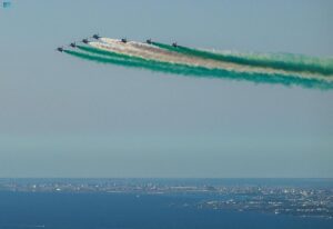 قدَّم فريق الصقور السعودية اليوم، عروضًا جويةً في سماء مدينة جدة؛ وذلك بمناسبة احتضان كورنيش جدة منافسات سباق جائزة السعودية الكبرى STC للفورمولا 1.