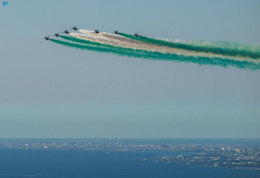 واستعرض فريق الصقور من خلال طائراته مهاراته في سماء كورنيش جدة بعروض مبهرة أظهرت المستوى العالي لقدرات الطيارين السعوديين، وشكَّلوا لوحات فنية نالت استحسان أهالي وزوار عروس البحر الأحمر.