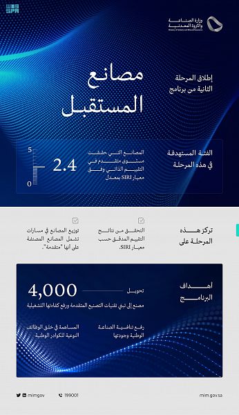 كما قامت وزارة الصناعة والثروة المعدنية خلال شهر نوفمبر الماضي بإطلاق الموقع الإلكتروني الخاص ببرنامج مصانع المستقبل(https://future-factories.mim.gov.sa/ar)
