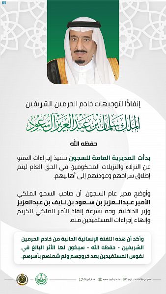 إنفاذًا لتوجيهات خادم الحرمين الشريفين الملك سلمان بن عبدالعزيز آل سعود – حفظه الله -، بدأت المديرية العامة للسجون تنفيذ إجراءات العفو عن النزلاء والنزيلات المحكومين في الحق العام ليتم إطلاق سراحهم وعودتهم إلى أهاليهم.