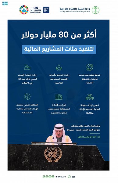 المملكة رصدت أكثر من 80 مليار دولار لتنفيذ مئات المشاريع المائية لتحقيق أهداف التنمية المستدامة خلال كلمتها بمؤتمر الأمم المتحدة للمياه