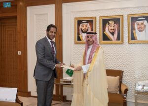 تسلم الرسالة صاحب السمو الأمير فيصل بن فرحان بن عبدالله وزير الخارجية، خلال استقباله بمقر الوزارة بالرياض، اليوم، عميد السلك الدبلوماسي سفير جمهورية جيبوتي لدى المملكة ضياء الدين بامخرمة.