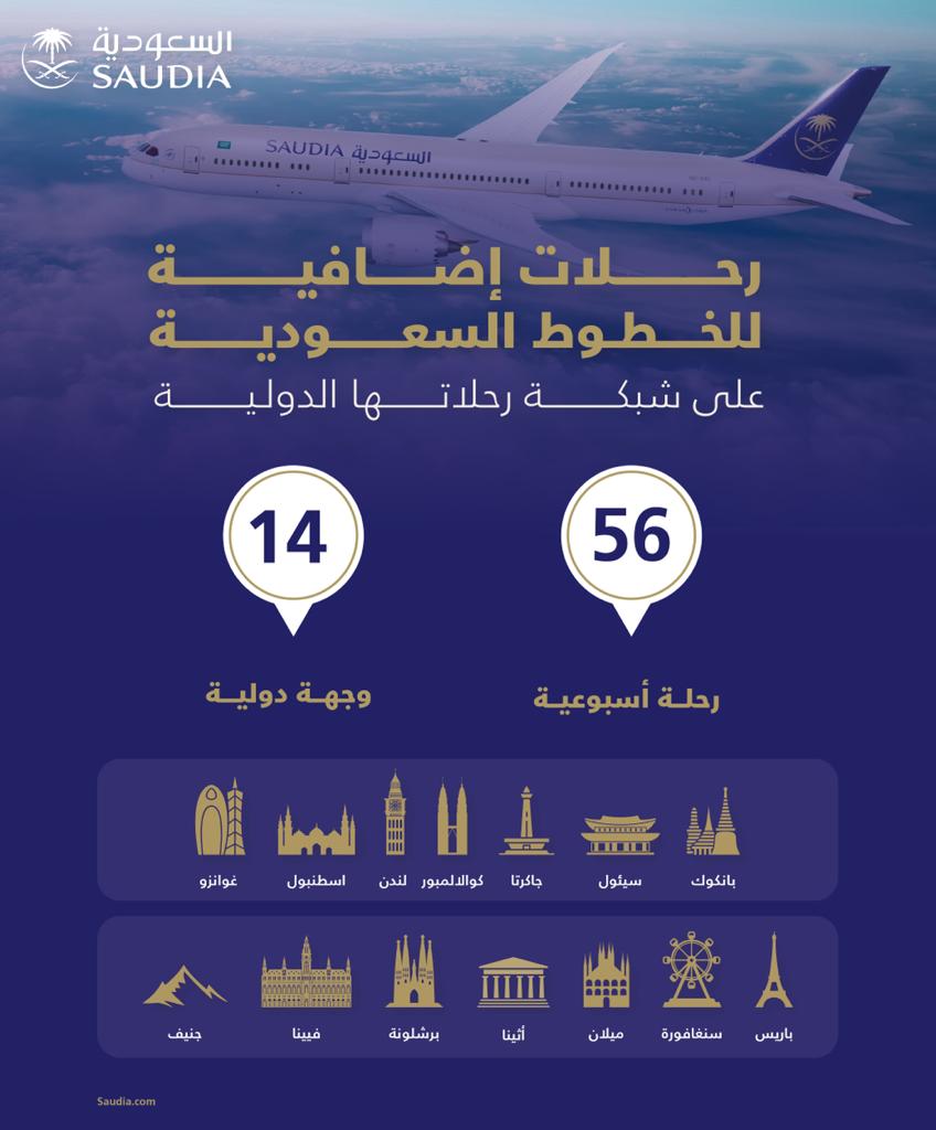 وبدأت “السعودية” في تنفيذ خطة زيادة الرحلات تدريجياً اعتباراً من 26 مارس الماضي وحتى 23 يونيو 2023م، فيما تبلغ الوجهات التي تم زيادة الرحلات إليها (14) وجهة في قارتي آسيا وأوروبا وتشمل بانكوك، سيئول، جاكرتا، كوالالمبور، باريس، لندن، اسطنبول، غوانزو، سنغافورة، جنيف، ميلان، أثينا، برشلونة، وفيينا.
