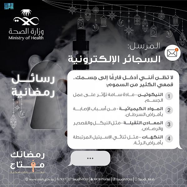 ونشرت “الصحة” عبر منصاتها الإعلامية , انفوجرافيك تضمن رسالة رمضانية موجهة إلى المجتمع نصت على (لاتظن أنني أدخل فارغاً إلى جسمك فمعي الكثير من السموم)، النيكوتين المادة السامة التي تؤثر على عمل الجسم والمواد الكيميائية المسببة بالإصابة بأمراض السرطان، وكذلك المعادن الثقيلة مثل النيكل والقصدير والرصاص، بالإضافة إلى النكهات المتعددة مثل ثنائي الاسيتيل المرتبطة بأمراض الرئة.