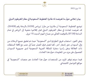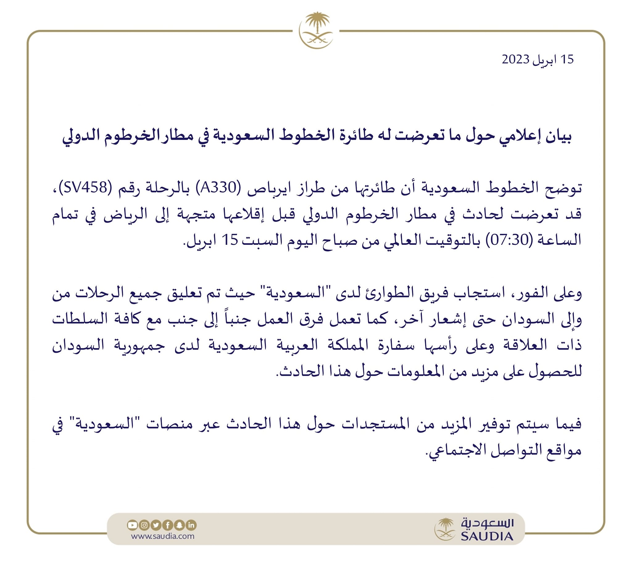 أعلنت الخطوط الجوية العربية السعودية إلغاء كافة رحلاتها ما بين المملكة العربية السعودية والسودان حتى إشعار آخر. وأصدرت بيانًا توضح فيه تضرر إحدى طائراتها من طراز إيرباص A330R نتيجة الاشتباكات الدامية على أرض مطار الخرطوم الدولي. وفي مايلي نص البيان