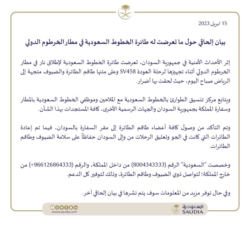 سويفت نيوز تنشر صورة وصول طاقم طائرة الخطوط السعودية المتضررة الى السفارة السعودية بالخرطوم