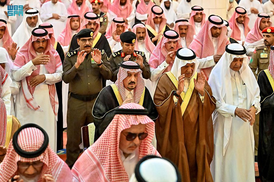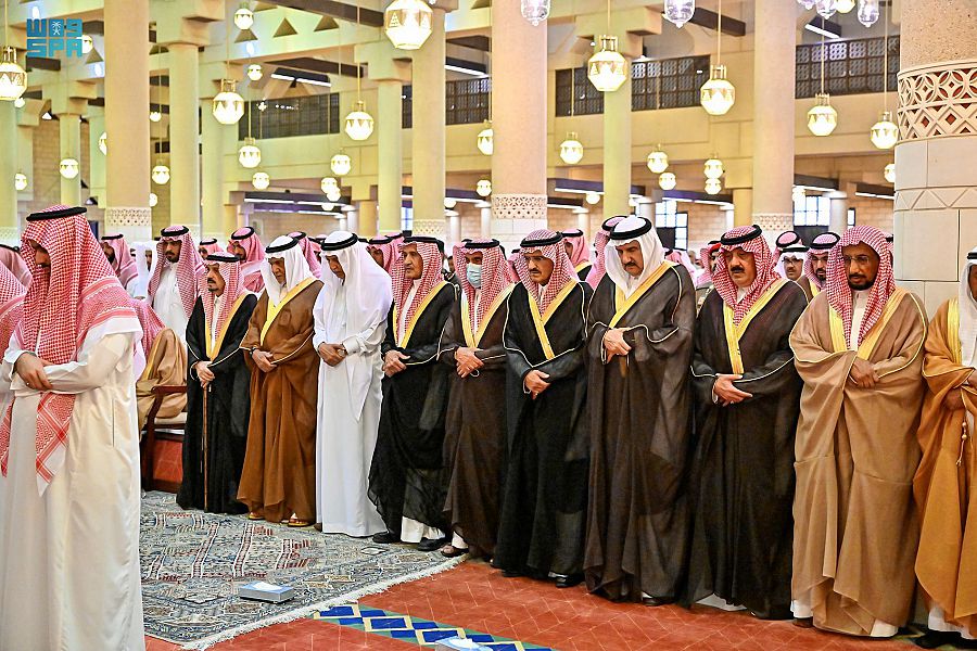 وأدّى الصلاة مع سموه سماحة مفتي عام المملكة رئيس هيئة كبار العلماء وإدارة البحوث العلمية والإفتاء الشيخ عبدالعزيز بن عبدالله آل الشيخ، وصاحب السمو الملكي الأمير تركي الفيصل بن عبدالعزيز، وصاحب السمو الأمير تركي بن عبدالله بن عبدالرحمن، وصاحب السمو الملكي الأمير سعود بن سعد بن عبدالعزيز، وصاحب السمو الملكي الأمير خالد بن سلطان بن عبدالعزيز، وصاحب السمو الملكي الأمير خالد بن سعد بن عبدالعزيز، وصاحب السمو الأمير متعب بن ثنيان بن محمد، وصاحب السمو الملكي الأمير خالد بن بندر بن عبدالعزيز مستشار خادم الحرمين الشريفين، وصاحب السمو الملكي الأمير منصور بن متعب بن عبدالعزيز وزير الدولة عضو مجلس الوزراء، وصاحب السمو الملكي الأمير محمد بن مشاري بن عبدالعزيز، وصاحب السمو الأمير نواف بن محمد بن عبدالله، وصاحب السمو الملكي الأمير فيصل بن محمد بن سعود بن عبدالعزيز، وصاحب السمو الملكي الأمير فهد بن تركي بن عبدالعزيز، وصاحب السمو الملكي الأمير عبدالعزيز بن سطام بن عبدالعزيز مستشار خادم الحرمين الشريفين، وصاحب السمو الأمير بندر بن سلمان بن محمد، وصاحب السمو الملكي الأمير الفريق الركن تركي بن بندر بن عبدالعزيز قائد القوات الجوية الملكية السعودية.