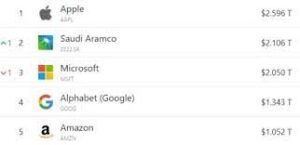 ولا تزال شركة “أبل” تحتفظ بصدارة الترتيب، مع قيمة سوقية تقارب 2.6 تريليون دولار، تليها “أرامكو” (2.11 تريليون دولار)، ثم “مايكروسوفت” (2.05 تريليون دولار).