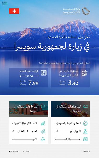 يبدأ معالي وزير الصناعة والثروة المعدنية الأستاذ بندر بن إبراهيم الخريف اليوم، زيارة رسمية إلى جمهورية سويسرا الاتحادية؛ بهدف استعراض الفرص الواعدة في قطاعي الصناعة والتعدين، وتحفيز جذب الاستثمارات النوعية للمملكة العربية السعودية، إضافةً إلى فتح قنوات تواصل جديدة مع المستثمرين بين البلدين.