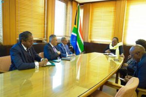 حضر اللقاء، سفير خادم الحرمين الشريفين لدى جمهورية جنوب أفريقيا سلطان اللويحان العنقري، والمستشار بمكتب معالي المستشار الدكتور فرحان الفرحان.