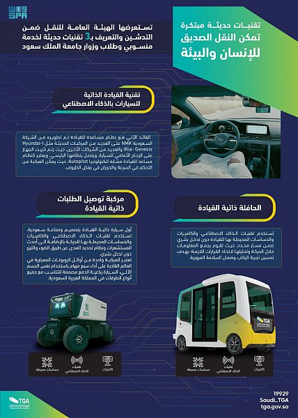 وتضمّن الحفل الذي استضافته جامعة الملك سعود بمقرها الرئيس بمدينة الرياض, تدشين الحافلة الذكية “ذاتية القيادة” التي تعتمد على تقنيات الذكاء الاصطناعي، ومجهزة بكاميرات وحساسات محيطة بها للقيادة دون تدخل بشري ضمن مسار محدد، حيث تقوم بجمع المعلومات خلال الحركة وتحليلها لاتخاذ القرارات اللازمة؛ وتصل سرعتها إلى 30 كم / الساعة، كما تتسع إلى 10 أشخاص في الوقت الواحد أو الرحلة الواحدة، كما تم التعريف واستعراض مركبة توصيل الطلبات ذاتية القيادة “Saudi Made” التي تعد أول سيارة ذاتية القيادة بتصميم وصناعة سعودية، تستخدم تقنيات الذكاء الاصطناعي والكاميرات والحساسات المحيطة بها للحركة, بالإضافة إلى أحدث المستشعرات ونظام تحديد المدى عن طريق الضوء والليزر دون تدخل بشري، وتُعد المركبة واحدة من أوائل الروبوتات المعيارية في العالم القادرة على أداء سبع مهام باستخدام نفس الجسم الآلي، والسيارة رباعية الدفع مصممة لتتناسب مع جميع أنواع الطرقات في المملكة العربية السعودية.