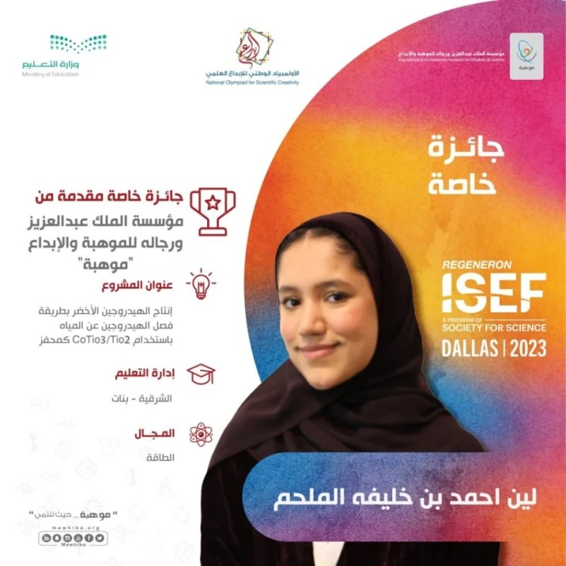 وفاز بالجوائز الخاصة كل من؛ الطالبة ديما محمد عيسى مروحي وحققت جائزة في مجال علوم الأرض والبيئة، كما حققت الطالبة عبير علي بن ناصر اليوسف جائزة في مجال علم المواد، بينما حققت الطالبة لين أحمد بن خليفة الملحم جائزة في مجال الطاقة، وأخيراً حقق الطالب وسام فهد عبدالمعطي القرشي جائزة في مجال الهندسة الطبية الحيوية.