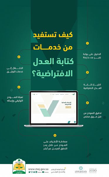 وللاستفادة من خدمات التوثيق عبر كتابة العدل الافتراضية، بينت الوزارة أن ذلك من خلال الدخول على بوابة ناجز Najiz.sa، والانتقال إلى خدمات التوثيق، واختيار كتابة العدل الافتراضية، ثم تعبئة النموذج التوثيقي وإرساله؛ ليتم تدقيق النموذج من قبل فريق مختص، ومصادقة الأطراف على النموذج من خلال رمز التحقق المرسل عبر أبشر.