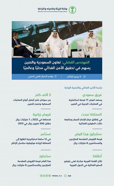 وكشف الوزير الفضلي، عن استعدادات فريق سعودي لعرض (17) فرصة استثمارية في قطاع المنتجات البحرية في الصين، مشيرًا إلى امتلاك المملكة لحوالي (03) آلاف كيلو متر من السواحل التي تنتج أفضل أنواع المنتجات السمكية التي تلبي طلب السوق المحلية وتصدر منها إلى الصين، مؤكدًا اهتمام المملكة بالاستثمار الزراعي المسؤول في الخارج، حيث تجاوزت أصول شركة “سالك” اليوم (30) مليار ريال، إذ تركز الشركة على الاستثمار في (12) سلعة استراتيجية لإنتاجها في الخارج ونقلها إلى المملكة خلال الـ10 سنوات المقبلة، وذلك لزيادة موثوقية سلاسل الإنتاج والإمداد.