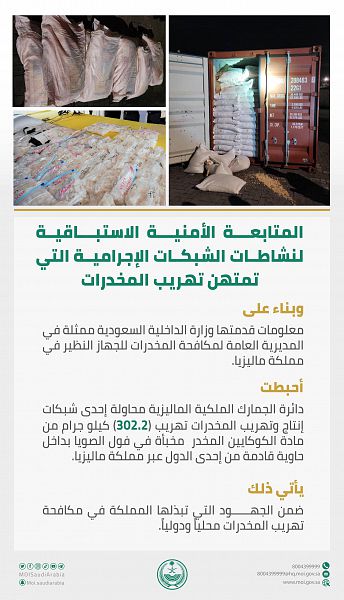صرح المتحدث الأمني لوزارة الداخلية العقيد طلال بن عبدالمحسن بن شلهوب، بأن المتابعة الأمنية الاستباقية لنشاطات الشبكات الإجرامية التي تمتهن تهريب المخدرات، وبناءً على معلومات قدمتها وزارة الداخلية السعودية ممثلة في المديرية العامة لمكافحة المخدرات للجهاز النظير في مملكة ماليزيا، أحبطت دائرة الجمارك الملكية الماليزية محاولة تهريب ( 302.2 ) كيلو جرام من مادة الكوكايين المخدر مخبأة في فول الصويا بداخل حاوية قادمة من إحدى الدول.