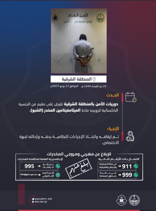 قبضت دوريات الأمن بالمنطقة الشرقية على مقيم من الجنسية الباكستانية لترويجه مادة الميثامفيتامين المخدر (الشبو)، وجرى إيقافه واتخاذ الإجراءات النظامية بحقه وإحالته لجهة الاختصاص.