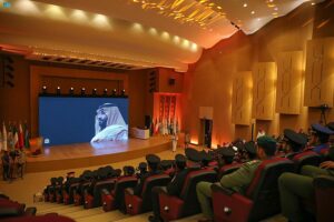 وعقب وصول سموه عزف السلام الملكي، ثم بُدئ الحفل الخطابي بالقرآن الكريم، بعد ذلك ألقى قائد الكلية كلمة عبَّر فيها عن سعادته وجميع منسوبي الكلية برعاية سمو وزير الحرس الوطني لحفل التخرج، ومشاركة الخريجين فرحتهم، مثمناً الدعم الذي تحظى به الكلية من سموه، ثم ألقى العقيد محمد الشويمان كلمة الخريجين، أشاد فيها بما تلقوه أثناء دراستهم من برامج أكاديمية وتدريبية مكثفة ومناهج حديثة، مشيداً بما تسلحوا به من أحدث النظريات الإستراتيجية والعملياتية والعلوم والمعارف العسكرية المشتركة، عقب ذلك شاهد سموه والحضور عرضاً مرئياً بعنوان “الريادة والتميز في التعليم العالي العسكري”.