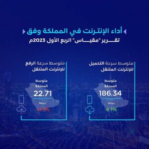 وكشف التقرير عن بلوغ متوسط سرعة التحميل للإنترنت المتنقل في المملكة 186.34 ميجابت في الثانية بنسبة تحسن تقدر بـ4.1% مقارنة بنفس الفترة من العام السابق، كما استعرض التقرير مؤشرات الإنترنت الثابت في المملكة بمتوسط سرعة تحميل 115.16 ميجابت في الثانية بنسبة تحسن تقدر بـ7.6% مقارنة بنفس الفترة من العام السابق ومتوسط سرعة رفع يصل إلى 50 ميجابت في الثانية.