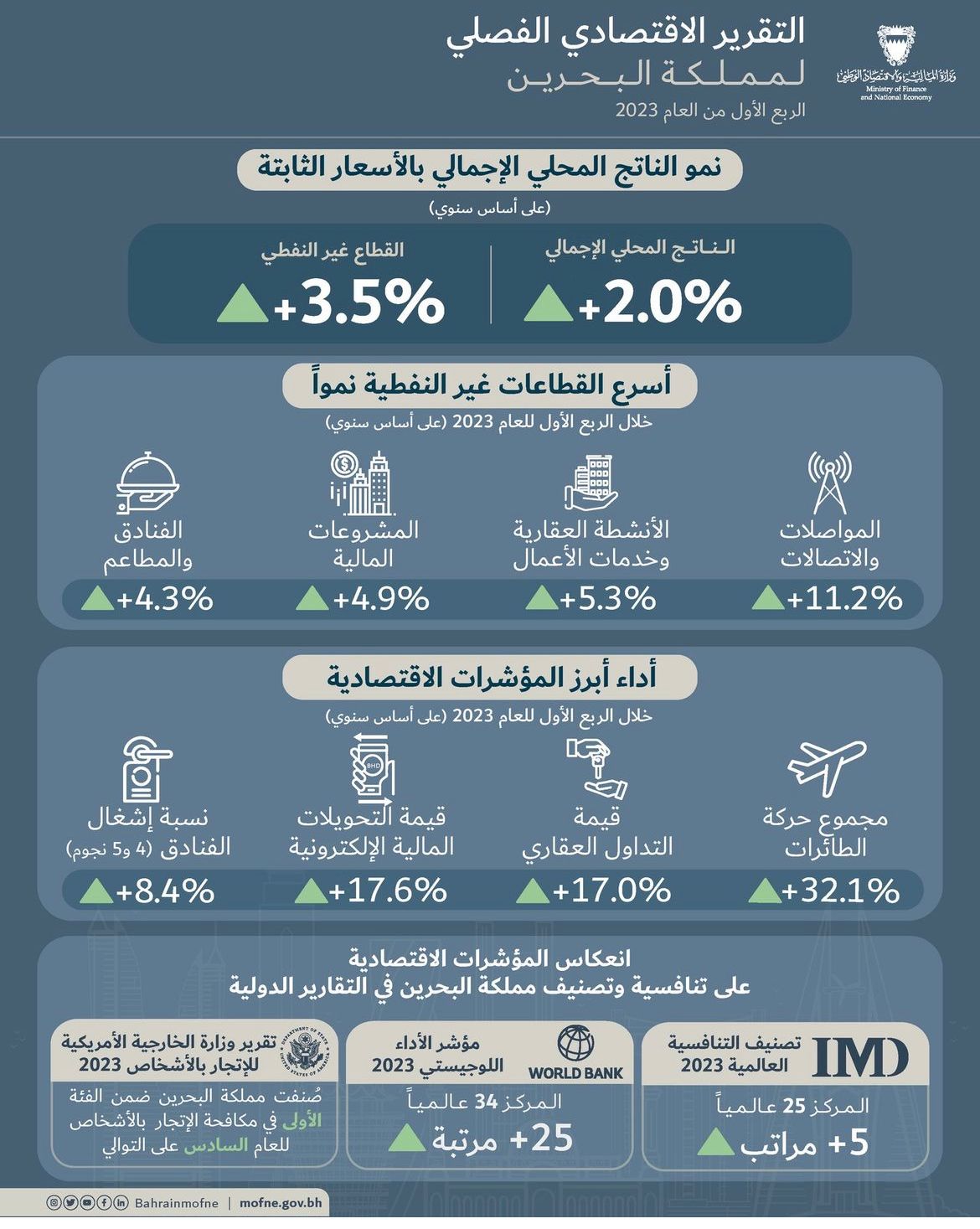 أوضحت وزارة المالية والاقتصاد الوطني بمملكة البحرين بأن التقرير الاقتصادي الفصلي لمملكة البحرين للربع الأول من عام 2023 ، والذي يسلط الضوء على الأداء الاقتصادي للمملكة، وأداء أبرز المؤشرات الاقتصادية المساندة، إلى جانب أهم المستجدات على صعيد المشاريع الاستراتيجية، وأداء مملكة البحرين في تقارير ومؤشرات التنافسية العالمية.