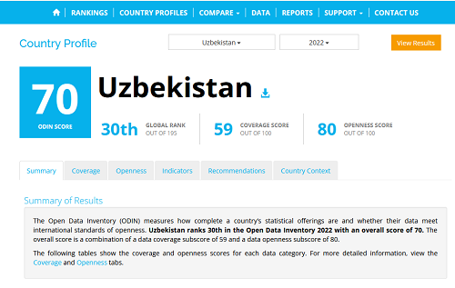تقدمت جمهورية أوزبكستان الى الترتيب الثلاثون على مستوى دول العالم لمؤشر البيانات المفتوحة بتسجيلها 70 نقطة في تصنيف البيانات المفتوحة بعد تقييم 195 دولة في العالم. وهذه النتيجة تعبير واضح عن الإصلاحات المنفذة في عهد فخامة رئيس الجمهورية شوكت مير ضيايف. أوزبكستان حصلت على الترتيب الأول على دول آسيا الوسطى حيث كان ترتيب الدول كازاخستان وقيرغيزستان وطاجيكستان وتركمانستان على التوالي – 51 – 92 – 126 – 195. الجدير بالذكر في عام 2022م سجلت جمهورية أوزبكستان 66 نقطة وحصلت على الترتيب الاربعون من بين 192 دولة تم تقييمها لمؤشر البيانات المفتوحة .