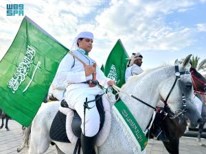وانطلقت المسيرة من جوار ممشى طريق الملك عبدالله غرب مدينة نجران، يتقدمها فرسان يحملون راية التوحيد “لا إله إلا الله محمد رسول الله”، وصور القيادة الرشيدة، وشعارات وطنية، وأخرى تحمل عبارات “نحلم ونحقق”، ووطن العزة والشموخ، تعبيرًا عن فرحتهم بهذه المناسبة الغالية، وسط تفاعل كبير من الحضور.