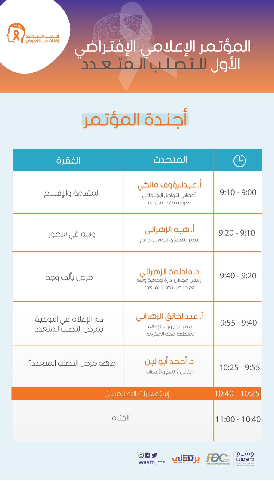 برعاية إعلامية من ملتقى الخبرات لتنظيم المعارض والمؤتمرات، تستعد جمعية وسم للتصلب المتعدد لإطلاق المؤتمر الإعلامي الإفتراضي الأول “التصلب المتعدد.. إضاءات على الغموض” لتوعية المجتمع الإعلامي بمرض التصلب المتعدد وذلك يوم الأربعاء الموافق 4 أكتوبر 2023 من الساعة 9:00 – 11:00 مساءً عن بعد عبر منصة “زوم”