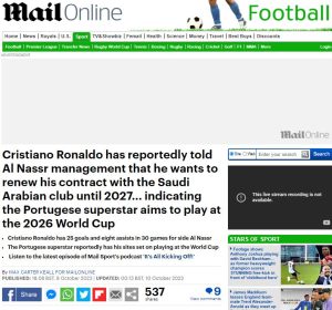 ذكرت صحيفة “ديلي ميل” البريطانية أن رونالدو قرر البقاء مع النصر السعودي حتى عام 2027، ويرغب في تمديد عقده مع الفريق لموسمين جديدين وأن النجم البرتغالي أبلغ إدارة النصر بقراره قبل السفر لخوض معسكر مع منتخب البرتغال.