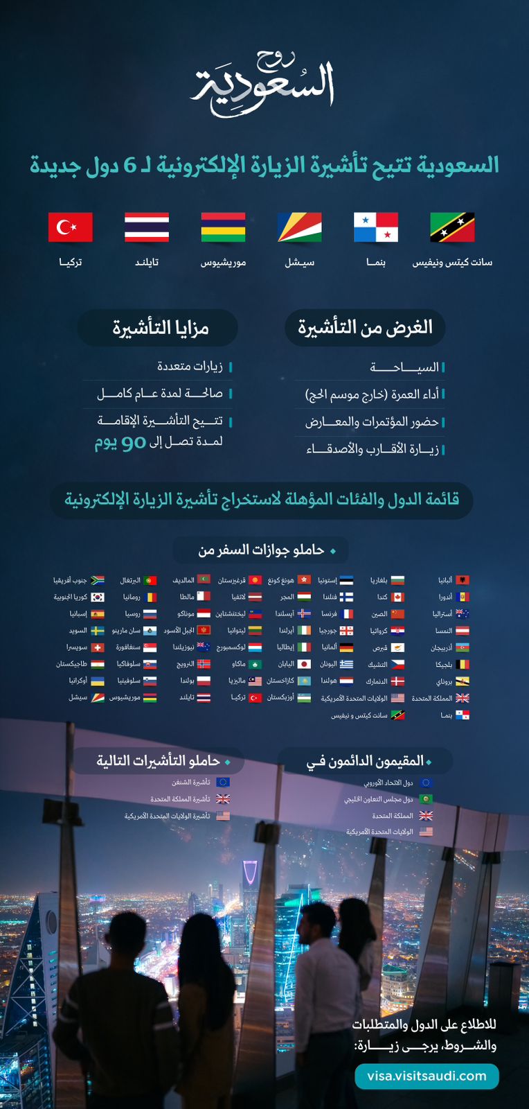 أعلنت وزارة السياحة عن إتاحة تأشيرة الزيارة “إلكترونيًا” لمواطني عدد جديد من الدول، والتي تضم تركيا، وتايلند، وبنما، وسانت كيتس ونيفيس، وسيشل، وموريشيوس، إما عن طريق طلب تأشيرة الزيارة إلكترونيًا أو مباشرة عند الوصول إلى أحد المنافذ الدولية للمملكة، وبذلك يصل عدد الدول إلى 63 دولة.
