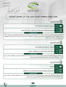 صرّح المتحدث الرسمي في هيئة الرقابة ومكافحة الفساد بأن الهيئة باشرت عدداً من القضايا الجنائية خلال الفترة الماضية، وجارٍ استكمال الإجراءات النظامية بحق مرتكبيها، وكانت أبرز القضايا على النحو الآتي: