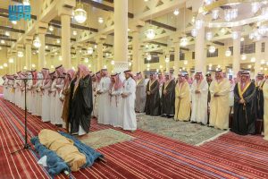 وأدى الصلاة مع سموه, صاحب السمو الملكي الأمير مشعل بن سعود بن عبدالعزيز، وصاحب السمو الملكي الأمير منصور بن سعود بن عبدالعزيز، وصاحب السمو الملكي الأمير خالد بن سعد بن عبدالعزيز، وصاحب السمو الملكي الأمير متعب بن عبدالله بن عبدالعزيز، وصاحب السمو الملكي الأمير فيصل بن خالد بن عبدالعزيز مستشار خادم الحرمين الشريفين، وصاحب السمو الأمير فيصل بن عبدالله بن محمد، وصاحب السمو الملكي الأمير سطام بن سعود بن عبدالعزيز، وصاحب السمو الأمير نواف بن محمد بن عبدالله، وصاحب السمو الملكي الأمير فيصل بن محمد بن سعود بن عبدالعزيز، وصاحب السمو الأمير تركي بن سعود بن محمد، وصاحب السمو الأمير متعب بن ثنيان بن محمد، وصاحب السمو الأمير تركي بن محمد بن عبدالله، وصاحب السمو الملكي الأمير حمود بن سعود بن عبدالعزيز، وصاحب السمو الملكي الأمير مصعب بن سعود بن عبدالعزيز، وصاحب السمو الملكي الأمير يوسف بن سعود بن عبدالعزيز، وصاحب السمو الملكي الأمير حسام بن سعود بن عبدالعزيز أمير منطقة الباحة، وصاحب السمو الملكي الأمير سلمان بن سعود بن عبدالعزيز، وصاحب السمو الملكي الأمير فيصل بن تركي بن فيصل بن تركي الأول، وصاحب السمو الأمير أحمد بن عبدالله بن عبدالرحمن، وصاحب السمو الملكي فيصل بن مشعل بن سعود بن عبدالعزيز أمير منطقة القصيم، وصاحب السمو الملكي الفريق الركن تركي بن بندر بن عبدالعزيز قائد القوات الجوية الملكية السعودية، وصاحب السمو الملكي الأمير فيصل بن سلمان بن عبدالعزيز أمير منطقة المدينة المنورة، وصاحب السمو الملكي الأمير محمد بن فيصل بن بندر بن عبدالعزيز، وصاحب السمو الملكي الأمير سعود بن نهار بن سعود محافظ الطائف.