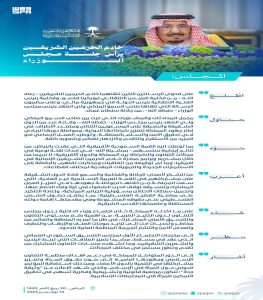 واطّلع المجلس، على الموضوعات المدرجة على جدول أعماله، من بينها موضوعات اشترك مجلس الشورى في دراستها، كما اطّلع على ما انـتهى إليه كل من مجلس الشؤون الاقتصادية والتنمية، ومجلس الشؤون السياسية والأمنية، واللجنة العامة لمجلس الوزراء، وهيئة الخبراء بمجلس الوزراء في شأنها، وقد انتهى المجلس إلى ما يلي: