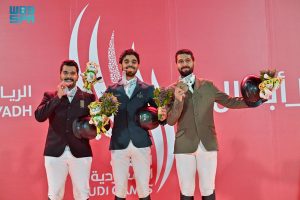 توج صاحب السمو الأمير عبدالله بن فهد رئيس الاتحاد السعودي للفروسية عضو اللجنة الأولمبية والبارالمبية السعودية، وصاحبة السمو الملكي الأميرة دليّل بنت نهار بن عبدالعزيز، نائب مدير دورة الألعاب السعودية الفارس خالد المبطي بالميدالية الذهبية في منافسات فردي قفز الحواجز (الفروسية) التي اختتمت اليوم في ميدان قفز السعودية في الجنادرية، في إطار دورة الألعاب السعودية 2023، فيما نال الفارس مشاري الحربي الميدالية الفضية، وحصل محمد العساكر على الميدالية البرونزية.