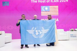 بعد ذلك، قام معالي رئيس الهيئة العامة للطيران المدني، بتسليم راية استضافة الآيكان 2024 إلى نظيره بدولة ماليزيا.