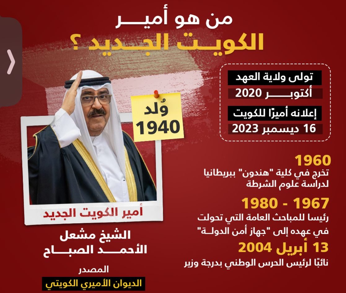أعلن اليوم  السبت تعيين ولي عهد الكويت الأمير مشعل الأحمد الجابر الصباح أميرا للبلاد، خلفا لأخيه الشيخ نواف الذي حكم الكويت ثلاثة أعوام وأعلن عن وفاته اليوم السبت عن 86 عاما.