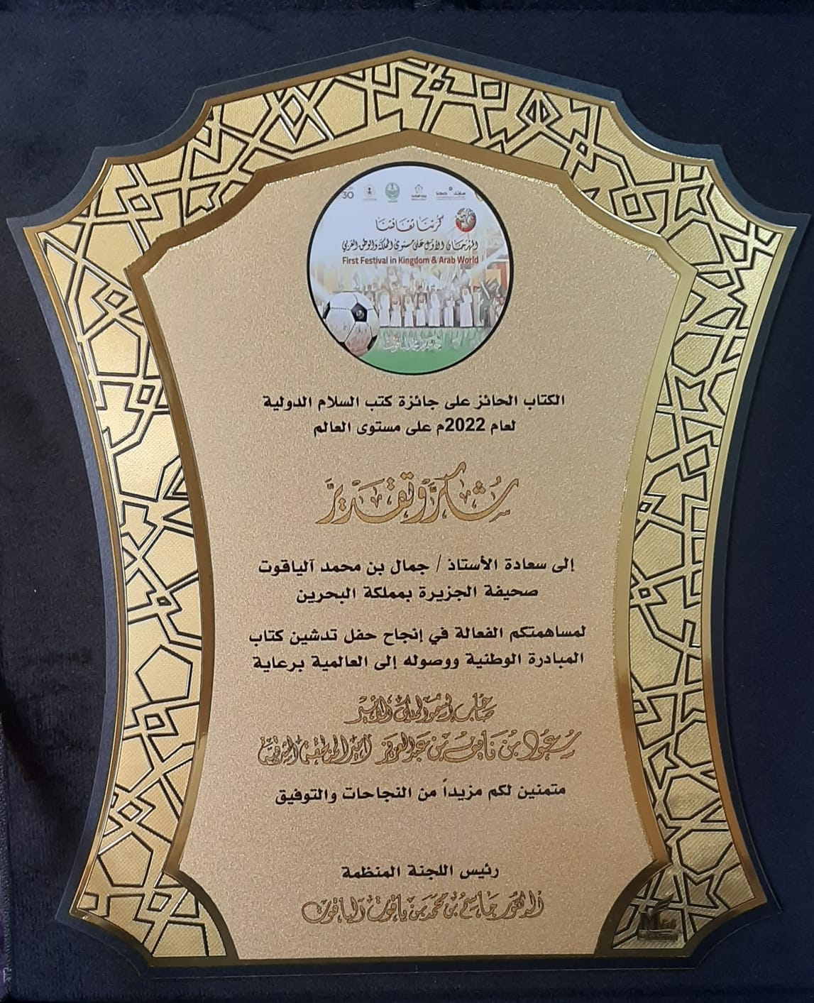 كرمت اللجنة المنظمة العليا لمهرجان “كرتنا ثقافتنا” الأول على مستوى المملكة العربية السعودية والوطن العربى – بتكريم الكاتب الصحفي جمال بن محمد الياقوت عضو الإتحاد العام للصحفيين العرب عضو الإتحاد الدولي للصحفيين مدير مكتب صحيفة الجزيرة بمملكة البحرين لمساهماته الفعاله فى إنجاح حفل تدشين كتاب المبادرة الوطنية ووصوله إلى العالمية وذلك فى الحفل الكبير الذي أقيم تحت رعاية صاحب السمو الملكي الأمير سعود بن نايف بن عبدالعزيز آل سعود أمير المنطقة الشرقية .