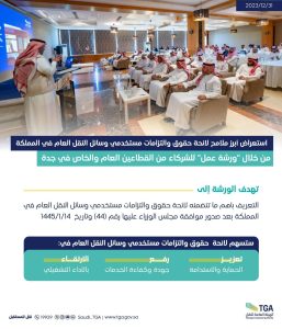 نظمت الهيئة العامة للنقل ورشة عمل لشركائها من القطاعين العام والخاص في مدينة جدة؛ بهدف التعريف بأهم ما تتضمنه لائحة حقوق والتزامات مستخدمي وسائل النقل العام في المملكة بعد صدور موافقة مجلس الوزراء بتاريخ 1445/1/14 ، وذلك تزامنًا مع بدء سريان أحكام اللائحة.
