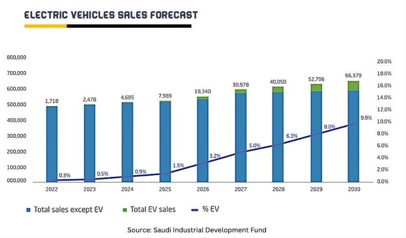 وقد أظهرت البيانات الصادرة عن هيئة الزكاة والضريبة والجمارك السعودية أن المملكة في عام 2022، قد استوردت 570 ألف سيارة، 42% منها مستوردة من الصين مما يدل على تطور صناعة السيارات الصينية الذكية والكهربائية والشيء الذي يدل على تكامل قوي مع خطط المملكة العربية السعودية ويفتح إمكانات هائلة للتعاون المشترك في هذا القطاع الحيوي الهام حيث بدأت السيارات التي تعمل بالطاقة الكهربائية للتو في أسوق المملكة العربية السعودية، وبموجب رؤية المملكة 2030، فسوف يتسارع تطويرها وتواجدها في السوق السعودي مما يسمح بتحسين البنية التحتية والكهربائية والخدمات الذكية في المملكة، ووفقاً لأبحات الشركات العالمية المتخصصة، فمن المتوقع أن تزيد الحصة السوقية لمركبات الطاقة الجديدة بنسبة 10% تقريباً بحلول عام 2030.