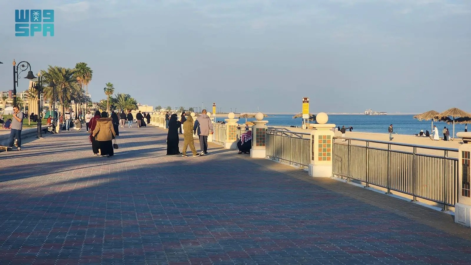 وبينما تفترش العائلات الشواطئ الرملية يمارس غالبية الشباب والفتيات رياضة المشي على امتداد الواجهة البحرية لمدينة الجبيل الصناعية.