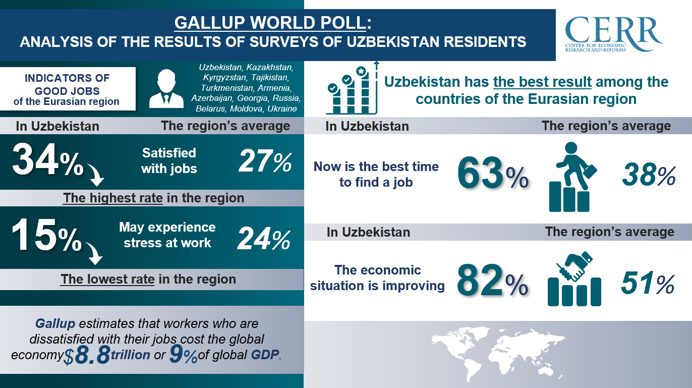 ووفقًا لتقديرات غالوب، تكلف الاقتصاد العالمي العمال الذين لا يشعرون بالرضا عن وظائفهم 8.8 تريليون دولار، أي 9% من الناتج المحلي الإجمالي العالمي. وأفاد 15% من العاملين في أوزبكستان بأنهم قد يواجهون ضغوطًا في العمل، مقابل 24% في المنطقة. ومنذ عام 2020، زادت نسبة الذين يعتقدون أن الوقت الحالي هو أفضل وقت لإيجاد وظيفة بنسبة 17%، ووصلت إلى 63%، وهو أحد أعلى معدلات في المنطقة، حيث بلغ المتوسط 38%.