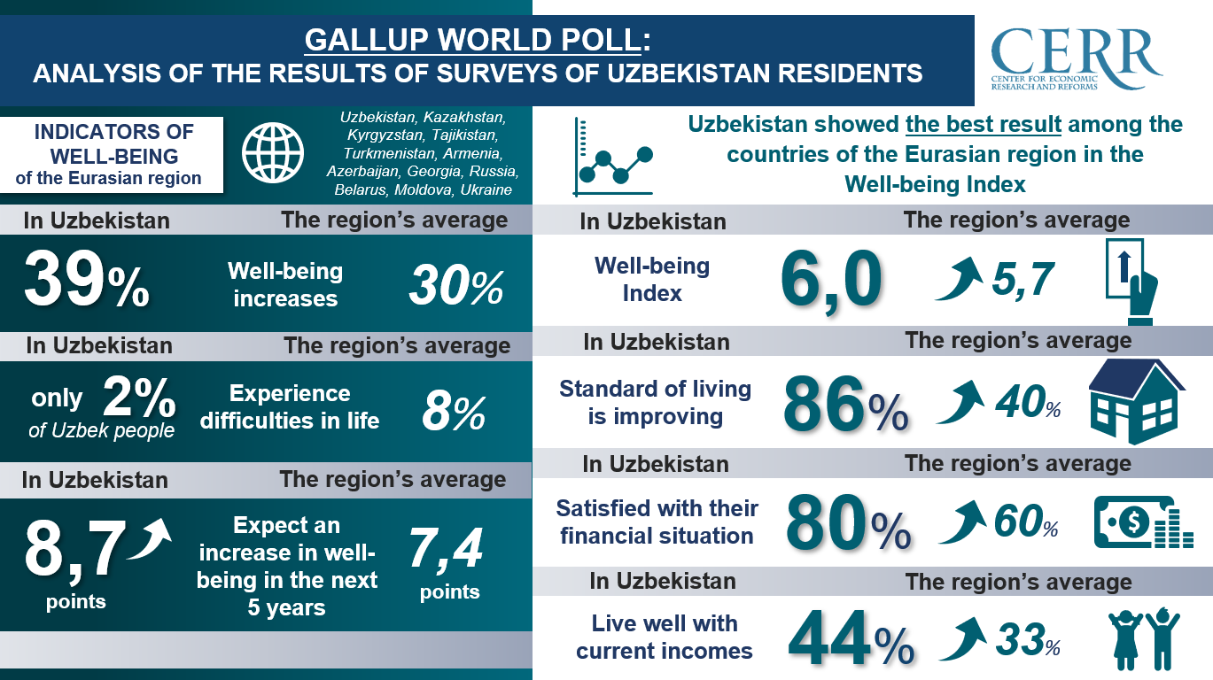 أظهرت نتائج التحليل الذي قام به مركز البحوث الاقتصادية والإصلاحات (CERR) لاستطلاع الرأي الذي أجرته مؤسسة غالوب لإستطلاع الرأي بمقارنة جمهورية أوزبكستان مع دول منطقة الشرق الأوراسي السابقة للاتحاد السوفيتي أن أوزبكستان حققت واحدة من أفضل النتائج بين دول منطقة الشرق الأوراسي السابقة للاتحاد السوفيتي حيث بلغ مؤشر الرفاهية في عام 2022 عدد 6.0 نقاط، بينما يُقدر متوسط المنطقة بنقاط 5.7. وبالتالي، أظهرت أوزبكستان واحدة من أفضل النتائج بين دول منطقة الشرق الأوراسي السابقة للاتحاد السوفيتي.