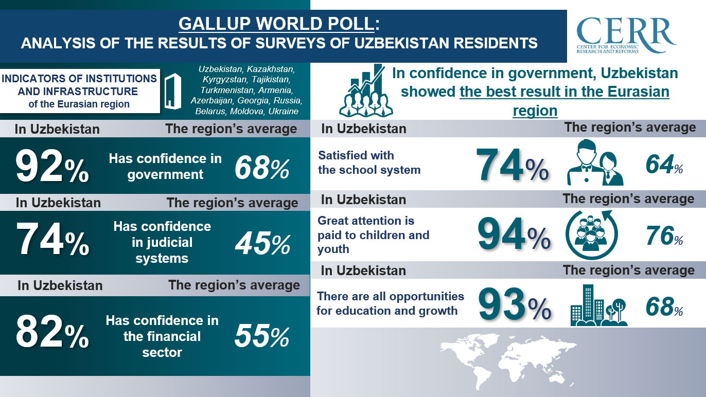 في غضون عامين، زاد ثقة الأوزبك في تحسن اقتصاد البلاد بنسبة 7%، وبلغت 82%. وكان متوسط هذا المؤشر في المنطقة 51%. كما تحسنت ثقة الأوزبك في حكومتهم وبلغت 92% في عام 2022، وهو أحد أفضل النتائج بين دول المنطقة، حيث بلغ المتوسط 68%. في الوقت نفسه، زادت نسبة الذين يثقون في النظام القضائي في أوزبكستان بنسبة 10% خلال عامين، ووصلت إلى 74% في عام 2022. وتعتبر هذه النسبة أقل بشكل ملحوظ في المنطقة، حيث تبلغ حوالي 45%. في المتوسط، يثق 55% من سكان المنطقة في القطاع المالي. وعبر 82% من الأوزبك عن ثقتهم “عالية جدًا” في النظام المصرفي والمالي. ولاحظ 94% من الأوزبك “اهتمامًا كبيرًا” بالأطفال والشباب، وهو مؤشر عالي أيضًا بالنسبة لمتوسط المنطقة البالغ 76%. وأفاد 93% من المشاركين الأوزبك بأنهم يتاح لهم جميع الفرص للتعليم والنمو في البلاد، بينما بلغ المتوسط في المنطقة 68%.
