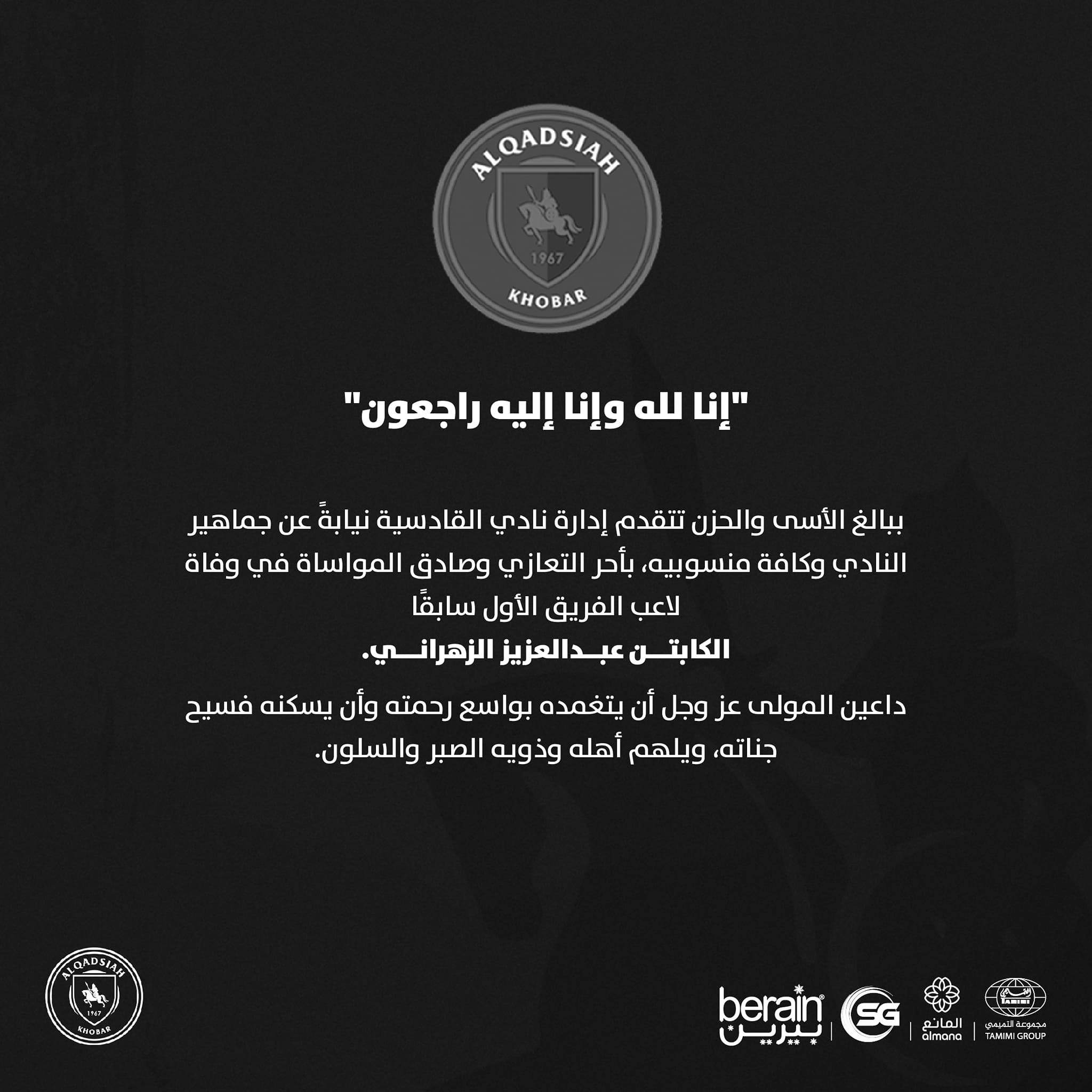نادي القادسية ينعي وفاة الكابتن عبد العزيز الزهراني