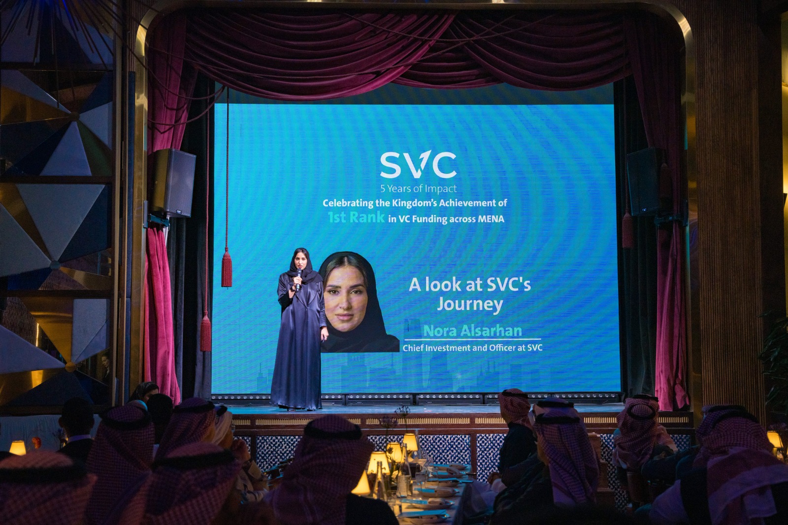 وشهد الحفل عرضاً قدمته الرئيس التنفيذي للاستثمار في (SVC) نورة السرحان، أوضحت فيه منجزات الشركة منذ تأسيسها بالأرقام وتحدثت عن الاتجاهات المستقبلية للشركة. فيما قدمت نائب رئيس الاستثمار في (SVC) هيفاء المقبل رؤية شاملة لأوضاع سوق الاستثمار الجريء إقليمياً وعالمياً ومقارنتها بوضع المملكة الإيجابي في الاستثمار الجريء.