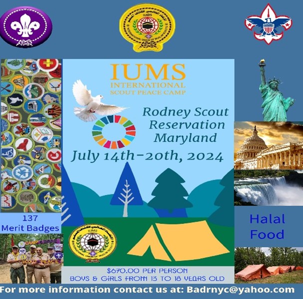 يواصل القائد بدر الزحزوحي، عضو اللجنة الكشفية الإسلامية العالمية عن قارة أمريكا والقائد الكشفي محمد العلوي وبإشراف الأمين العام للاتحاد العالمي للكشاف المسلم الدكتور زهير غنيم ، التحضيرات لإقامة مخيم السلام الكشفي الدولي 2024 المزمع إقامته صيف هذا العام في محمية رودني في مقاطعة ماريلاند الأمريكية بالتعاون بين مجلس دلمارفا في ويلمنجتون ديلاوير“ Del Mar Buy Scouts of America” ، بجمعية الكشافة الأمريكية والاتحاد العالمي للكشاف المسلم .