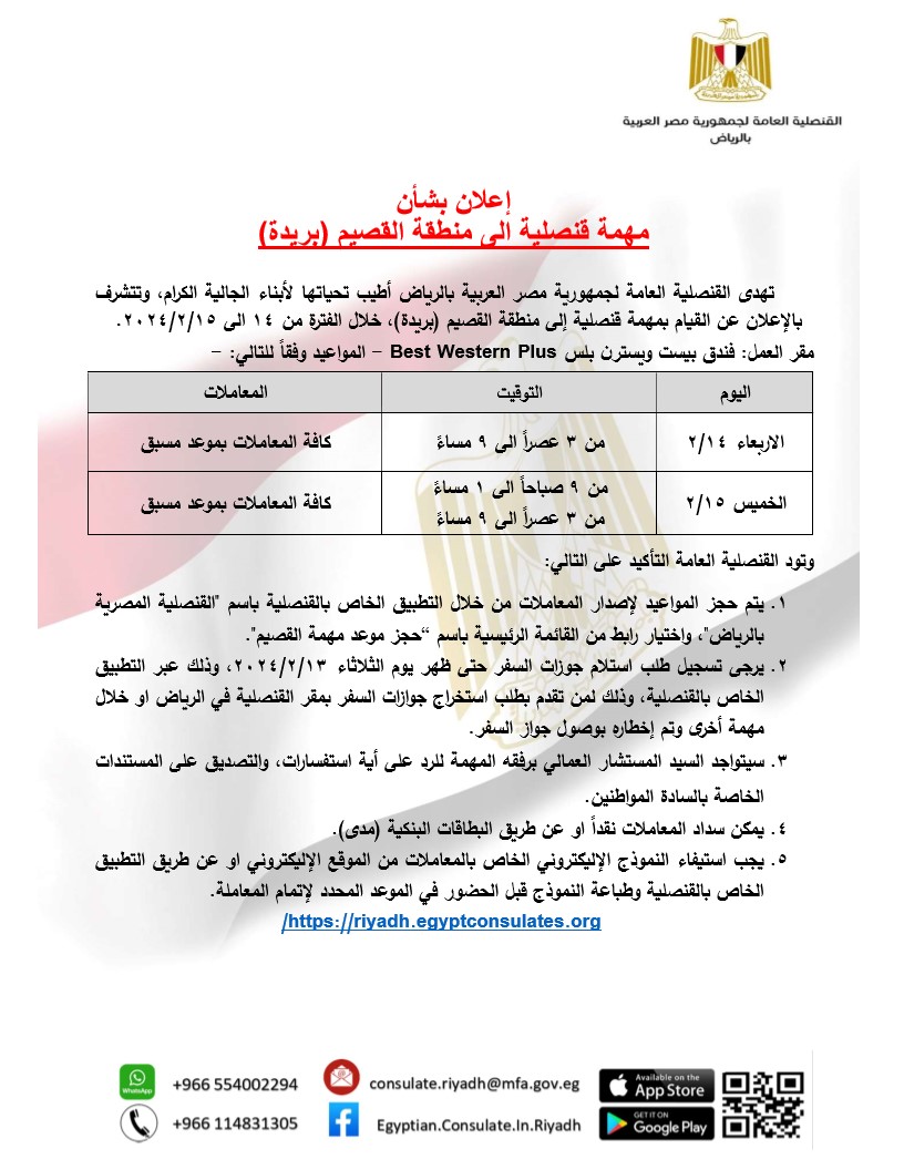أعلن السفير طارق المليجي القنصل العام لجمهورية مصر العربية بالرياض عن توجه مهمة قنصلية جديدة إلى منطقة القصيم يومي الأربعاء والخميس القادمين 14و15 فبراير الجاري لإنجاز كافة المعاملات التي تمت بوعد مسبق وذلك في فندق بست ويسترن بلس.
