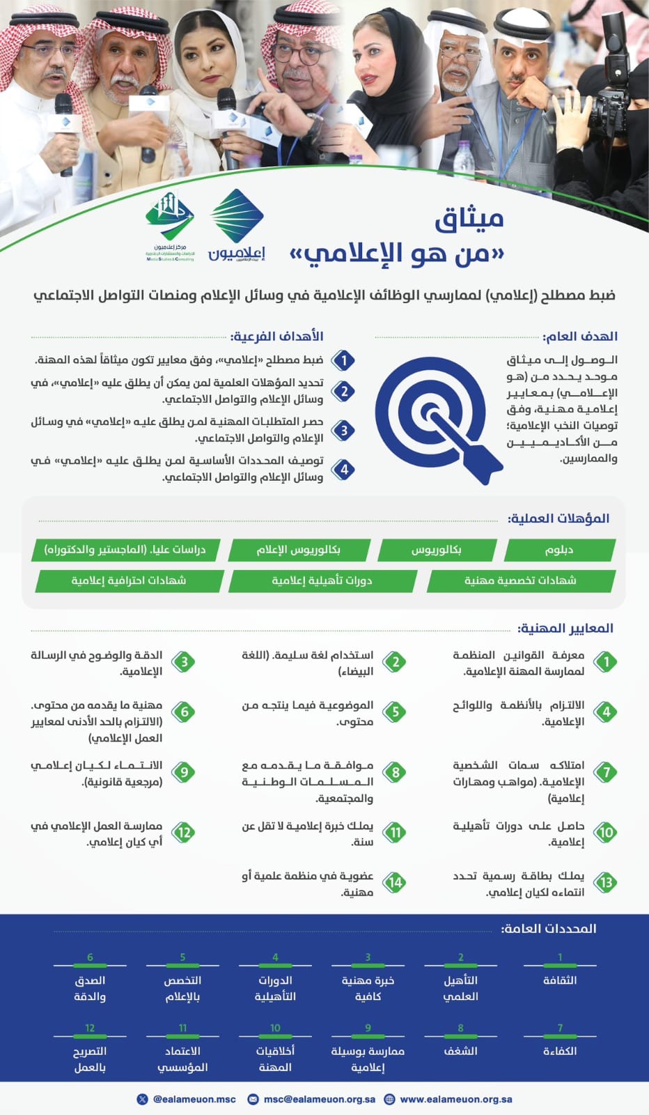 أعلنت جمعية إعلاميون ميثاق من هو الإعلامي، على هامش الندوة التي نظمها مركز اعلاميون للدراسات والاستشارات الإعلامية بعنوان: (المعايير المهنية لممارسي الإعلام)، وتضمن الميثاق معايير مهنية بلغت 14 معيار ومحددات عامة بلغت 12 محدد. وأكد رئيس مجلس إدارة جمعية إعلاميون الدكتور سعود الغربي في كلمته ببداية الندوة أن هذا الجهد العملي والمهني استغرق وقته من الدراسة والتحكيم حرصاً بأن يكون شاملاً وموضوعياً، وأن يساهم في ضبط مصطلح (إعلامي) لممارسي الوظائف الإعلامية في وسائل الإعلام ومنصات التواصل الاجتماعي، مبيناً أن هذا الميثاق حظي بمباركة جهة الاختصاص ويتوافق مع الجهود التنظيمية في هذا الإطار. وطالب الغربي بتطبيق هذا الميثاق بشكل عملي وأن تجمع كل الجهود لضبط فضاء الإعلام بشكل عام والعاملين فيه.
