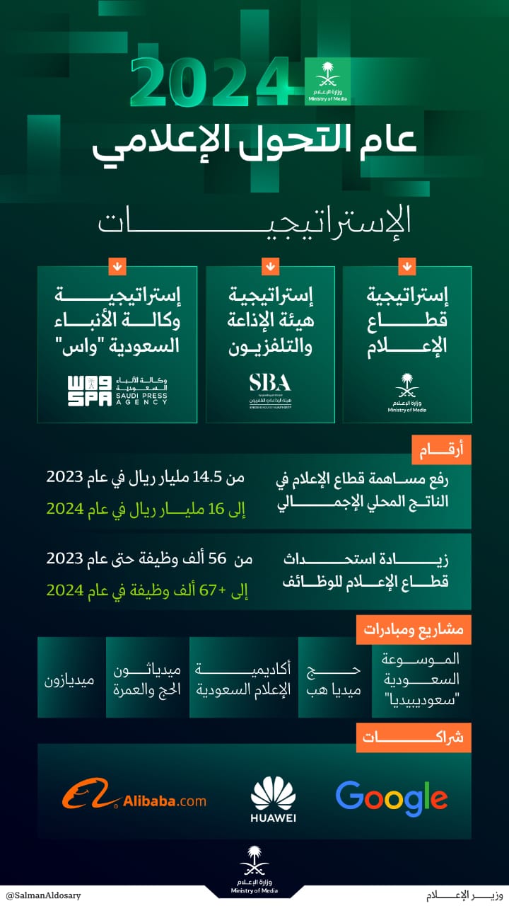 أكد معالي وزير الإعلام الأستاذ سلمان بن يوسف الدوسري , أن الإعلام السعودي ينتظره مستقبل حافل بالمنجزات والتحوّلات المنشودة في مختلف قطاعاته، مبينًا أبرز الملامح الإستراتيجية لمنظومة الإعلام للعام الجاري، التي سيتم تحقيقها بعدد من المبادرات والمشروعات والبرامج والأعمال، معلنًا أن عام 2024 هو عام التحول الإعلامي في المملكة، والاستعداد لمصافحة حارّة بين الإعلام السعودي والمستقبل.
