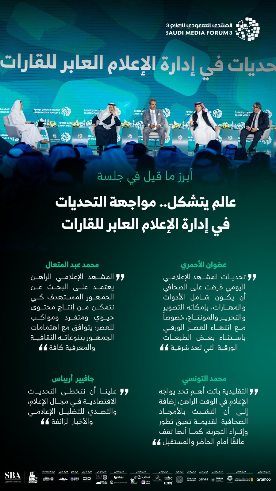 ناقشت جلسة “مواجهة التحديات في إدارة الإعلام العابر للقارات”، ضمن فعاليات المنتدى السعودي للإعلام بالرياض اليوم، أهمية دمج التقنيات الجديدة بشكل فعّال في إنتاج المحتوى الإعلامي، وتحديات جذب الجمهور بما يضمن تواصل تفاعلهم عبر بناء ثقتهم في مصداقية المؤسسة الإعلامية، إضافة إلى الممارسات المتبعة لبناء أسس قوية للاستدامة والمرونة في صناعة الإعلام على المدى الطويل.