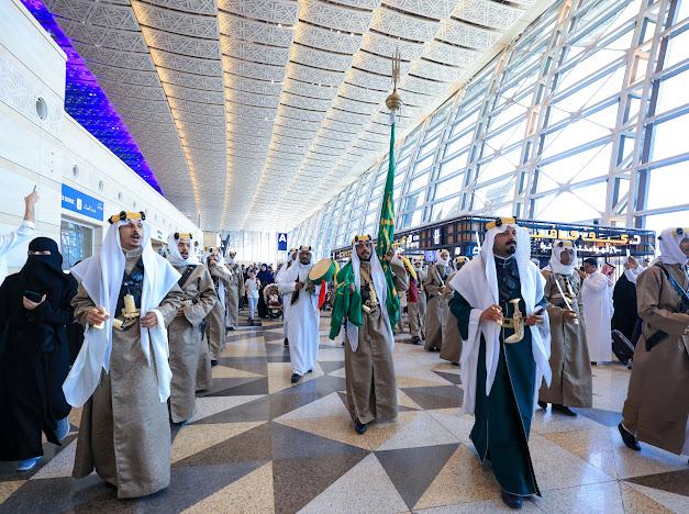 وقدّمت الفرقة التراثية العرضة السعودية في مختلف صالات المطار وشهدت تفاعل كبير من المسافرين الذين أبدوا أعجابهم بالعروض والأناشيد الوطنية، حيث قاموا بالتقاط الصور التذكارية معبِّرين عن أصالة حاضرهم بعبق ماضيهم وما تحقق للمملكة من تطور ونمو على مدى الثلاثة القرون الماضية في شتَّى المجالات.
